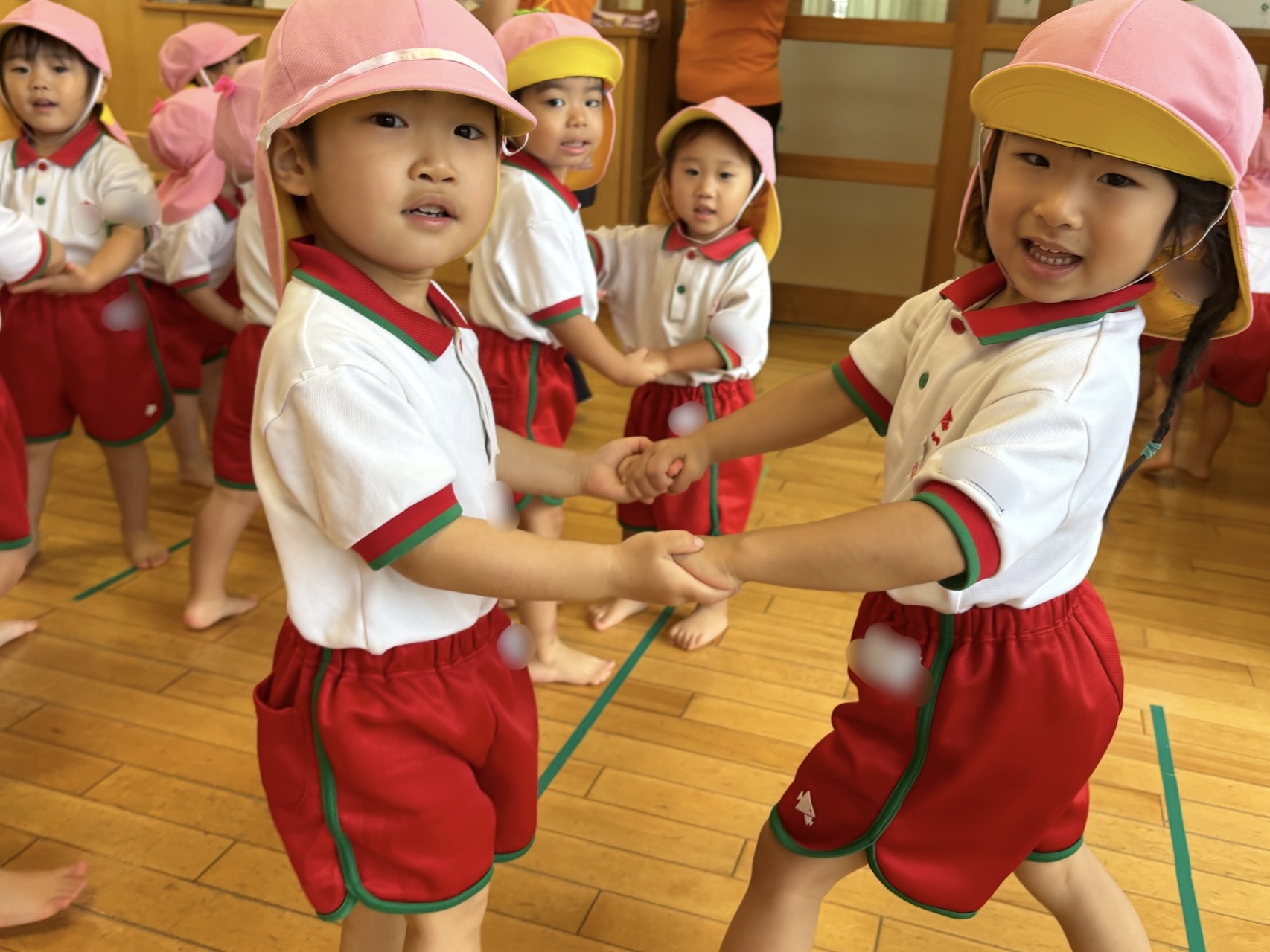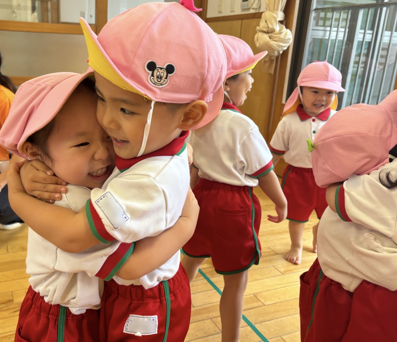 間奏ではお友だちと手をつないで体をぐーんと伸ばし、「ギューッ♡」