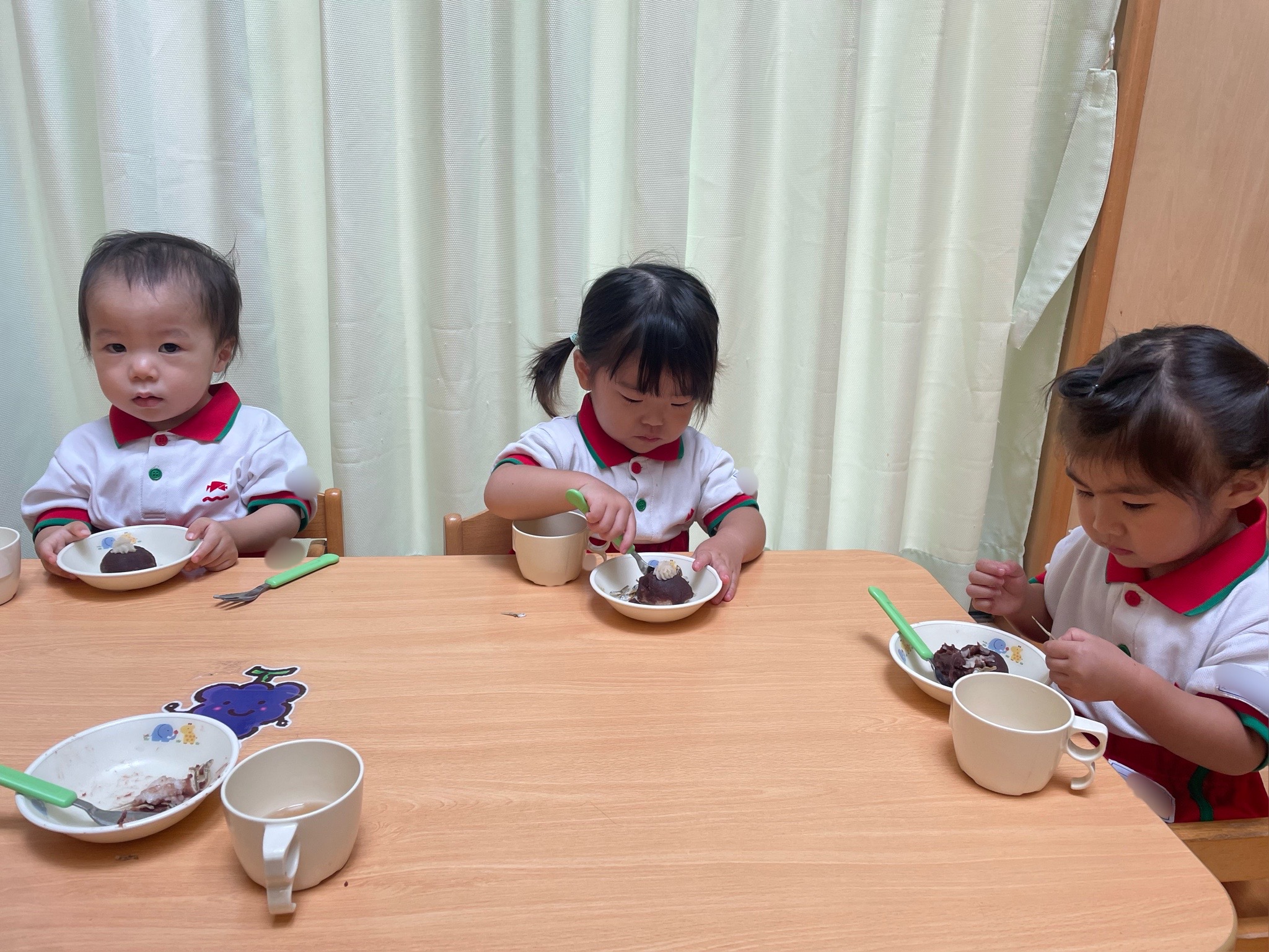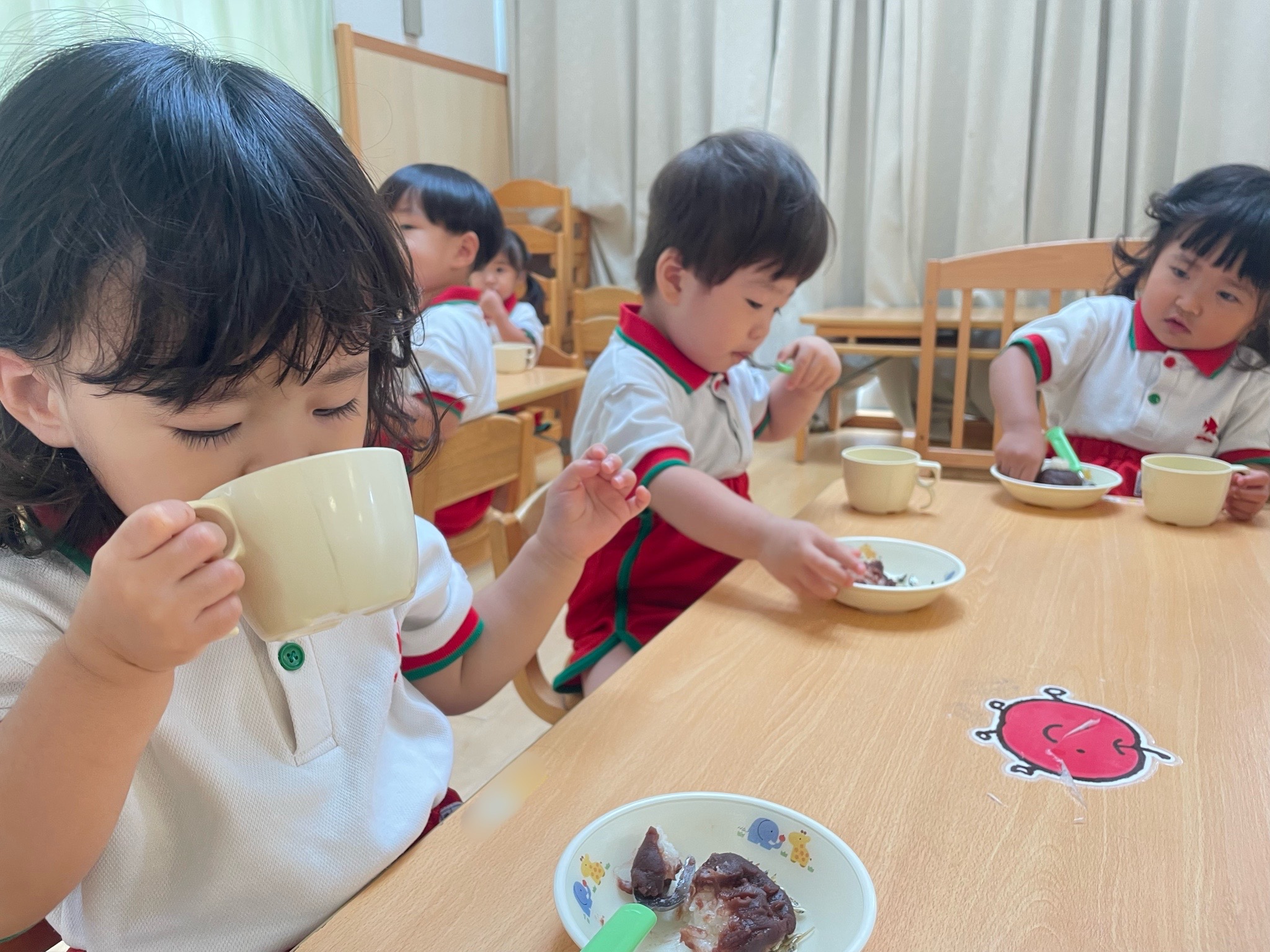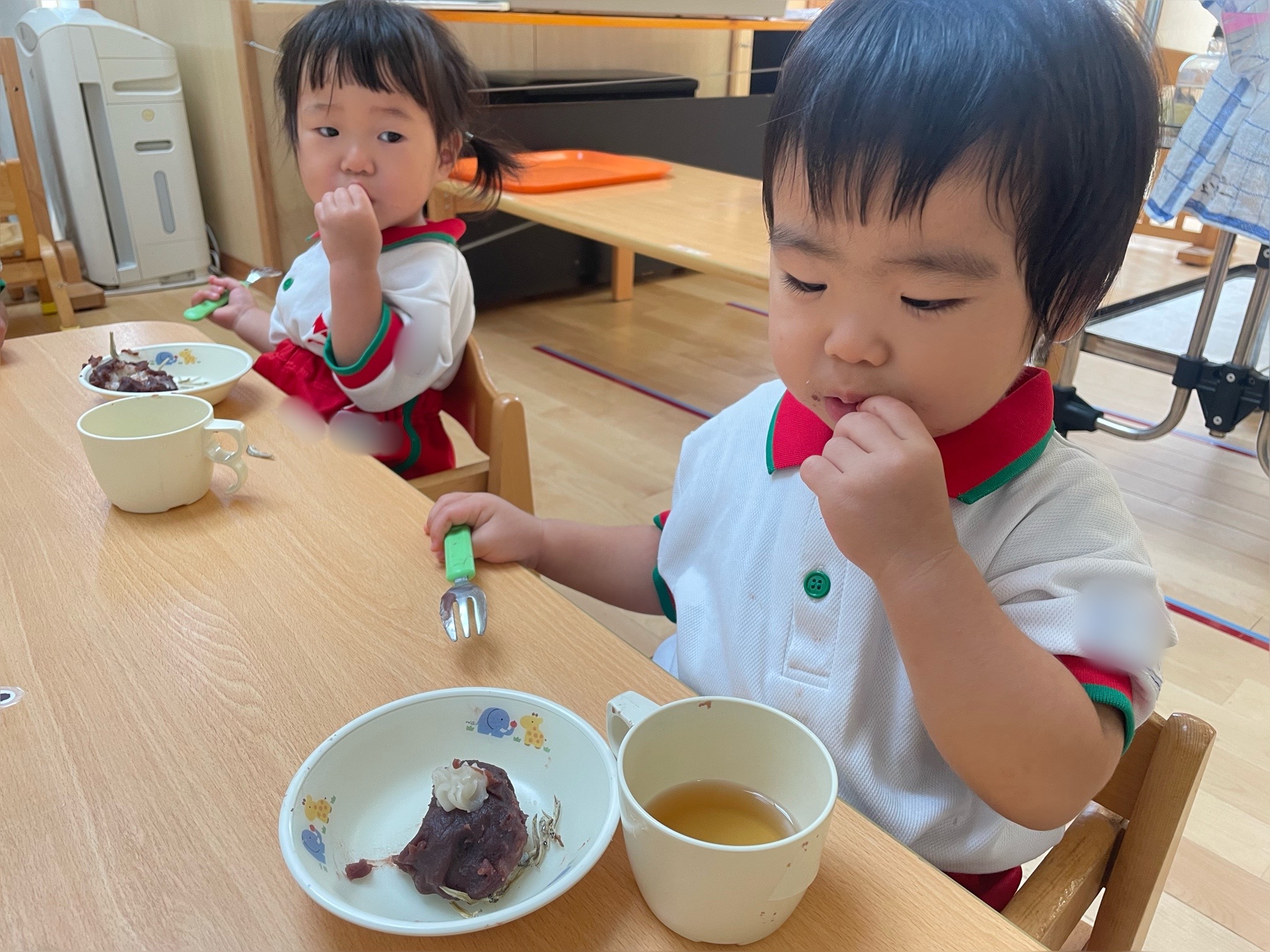 給食やおやつでは同じ机の友だちと微笑んだり話したりする姿も見られています!