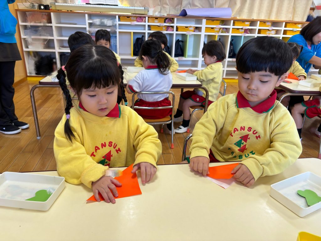 「これかな?」「こうやって折るんだよね?」と、先生のお話をよ〜く聞きながら、指先を使って一生懸命折るはな組さん👀✋