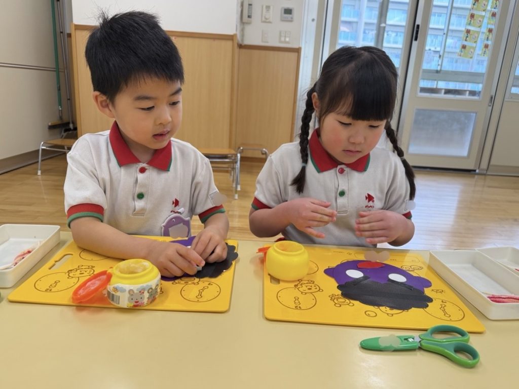 鬼の顔の口や眉毛を真剣にハサミで切っていますね✂️さらに切ったパーツを上手にのりで貼っています!