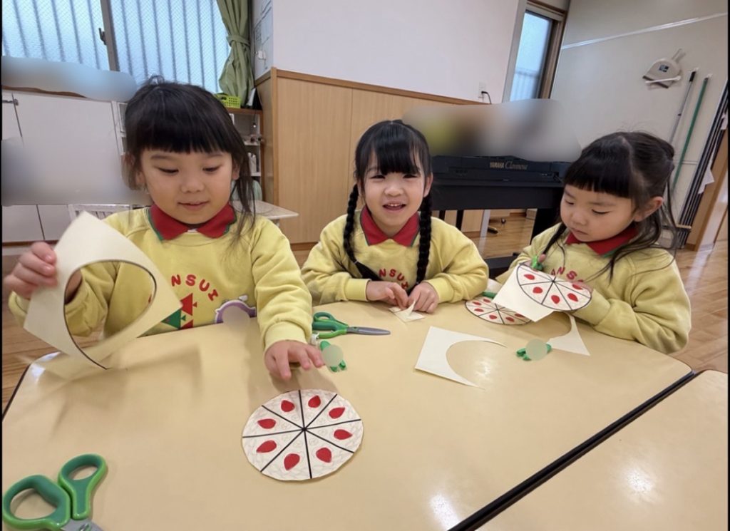 切ったケーキの形を数えて何個あるのかみんなで数えたり、並べたりして楽しく活動できました😊